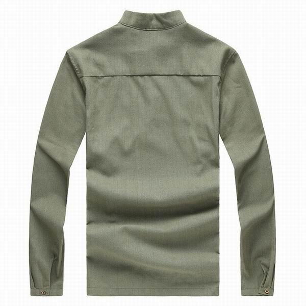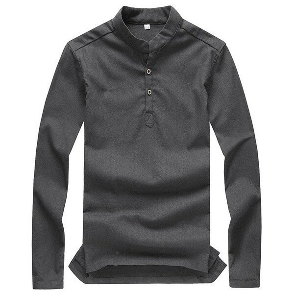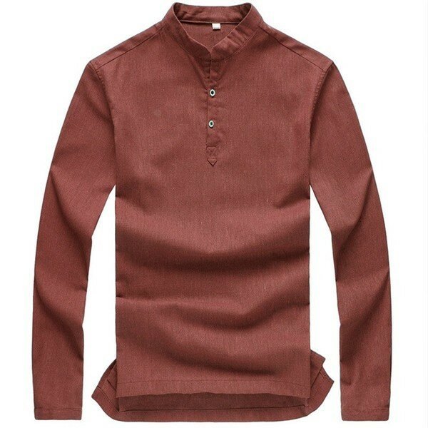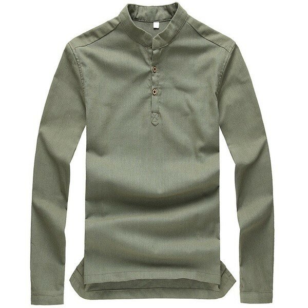 • コットンリネンVシェイプスタンドカラーサイドスリット裾ソリッドキャンディーカラーロングスリーブシャツ