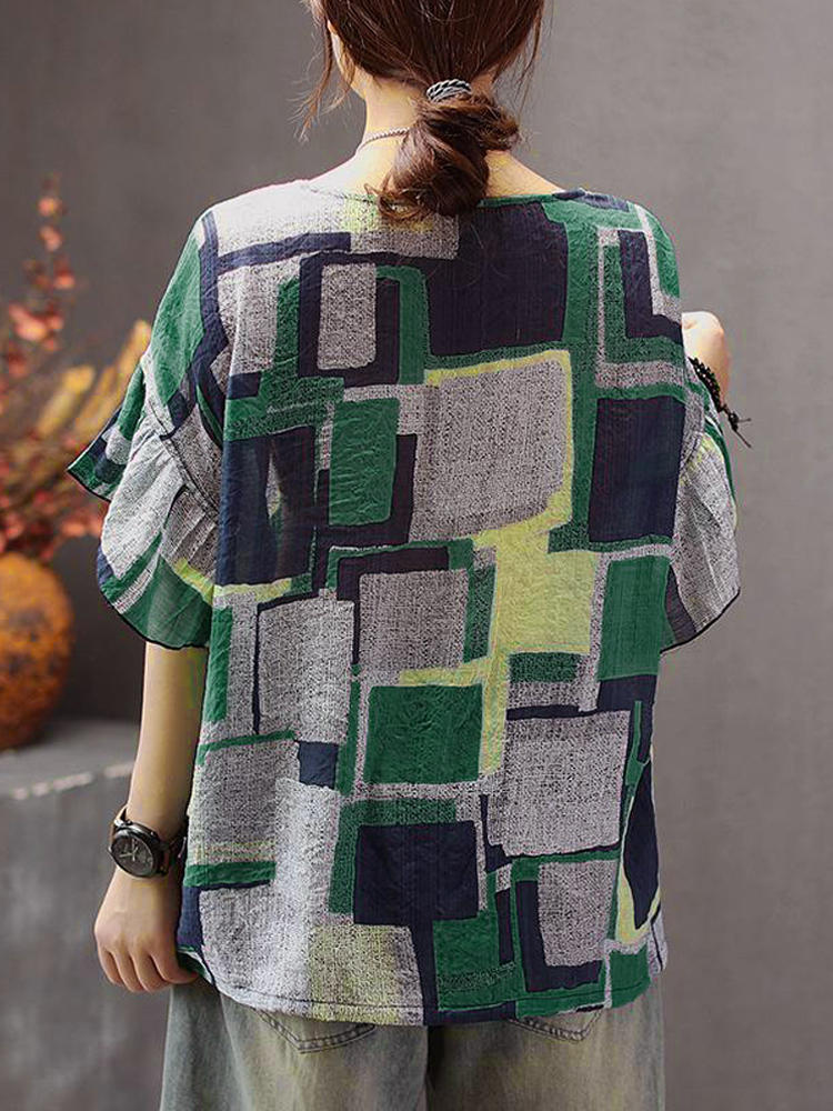 • 女性半袖ラウンドネックカジュアルプリントブラウス