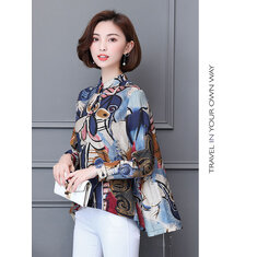 PlusサイズM-5XL女性の花のプリントシフォンシャツロングスリーブルーススタンドカラーブラウス